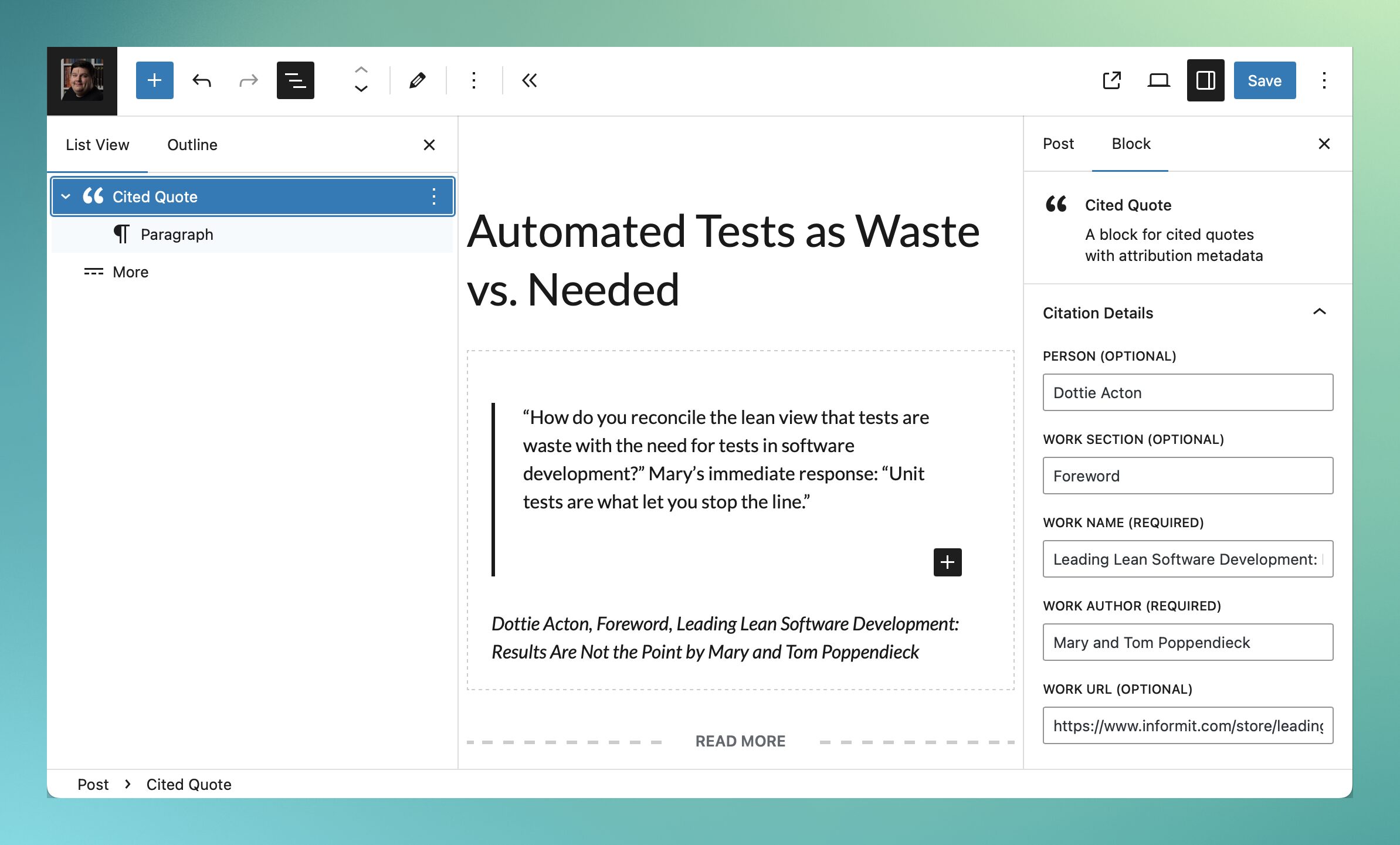 * Description: A Gutenberg block for creating cited quotes with attribution metadata