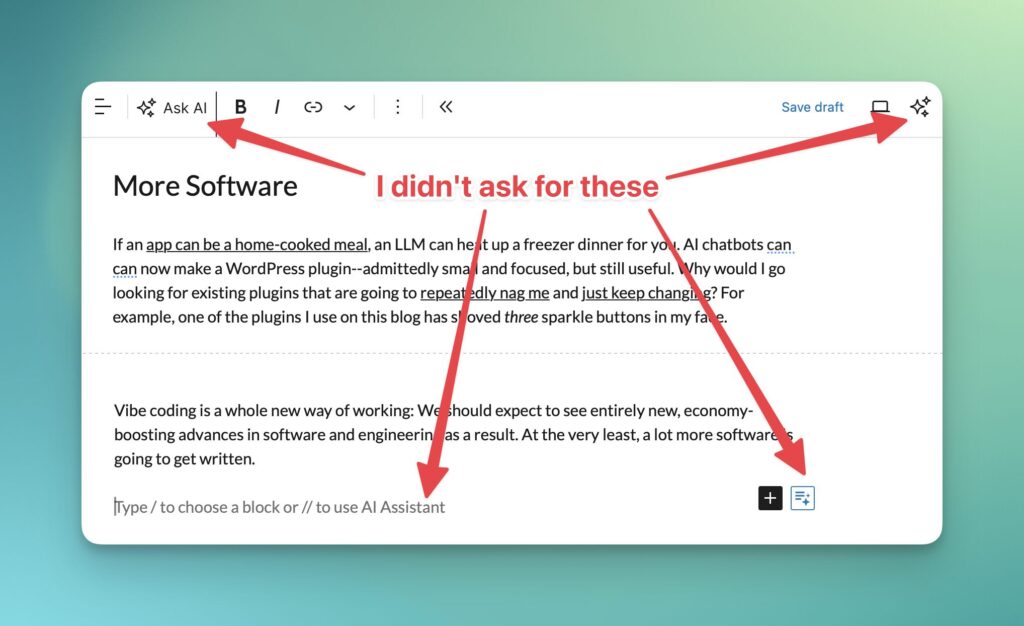 AI chatbots can now make a WordPress plugin–admittedly small and focused, but still useful. Why would I go looking for existing plugins that are going to repeatedly nag me and just keep changing? For example, one of the plugins I use on this blog has shoved three sparkle buttons (and a placeholder reminder) in my face.
