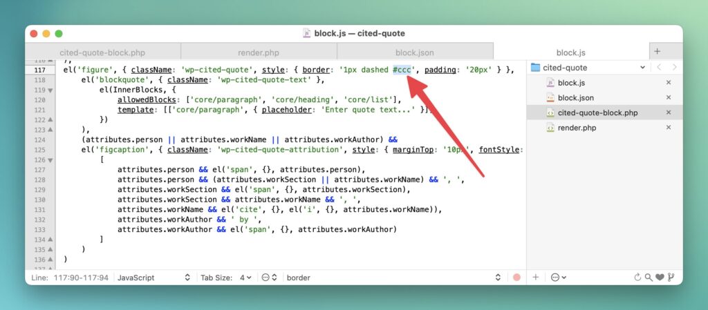 This functions perfectly. I’d like a UX improvement. When I’m typing the quote, it’s difficult for me to edit the author etc. because the Gutenberg Editor’s right-hand sidebar shows the block setting for the (e.g.) Paragraph inside, rather than the Cited Quote it’s within. I can use the Document Overview to click the Cited Quote manually, so its settings show in the sidebar, but I’d like Cited Quote to also have a toolbar that is visible when editing anything within the cited quote. Give me all files with those changes incorporated.